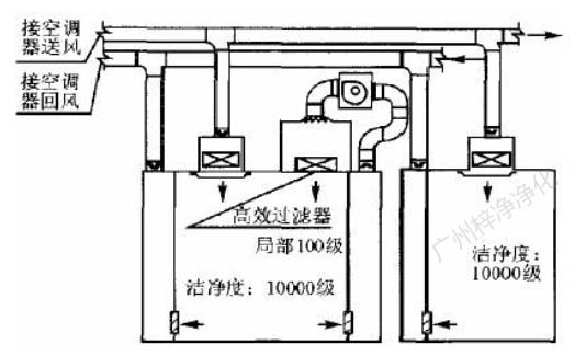 此方式的缺點是設置循環風機箱及處理噪聲,需要較大的空間,而通常百級區周圍風管都比較密集,需要精心布局。此方式百級區上部靜 壓箱相對百級區室內為正壓,頂棚高效過濾器與吊架間的滲漏,為靜壓箱流向室內,直接影響百級區潔凈度。對施工質量要求較高。(具 體可參考:
